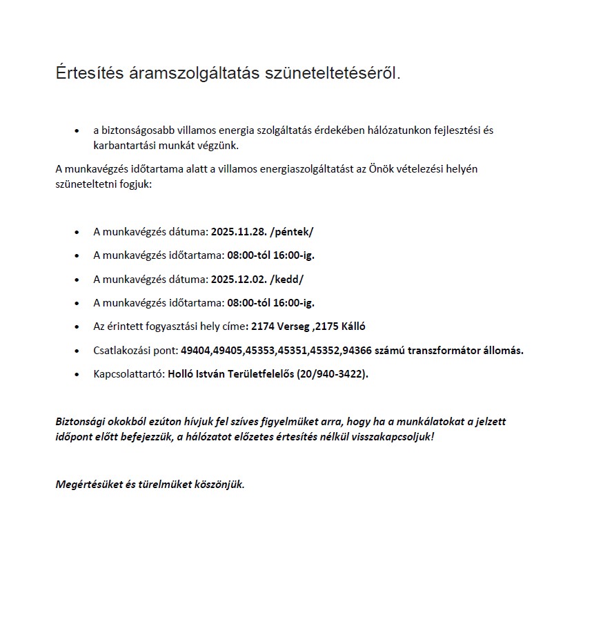 Értesítés áramszolgáltatás szüneteltetéséről.